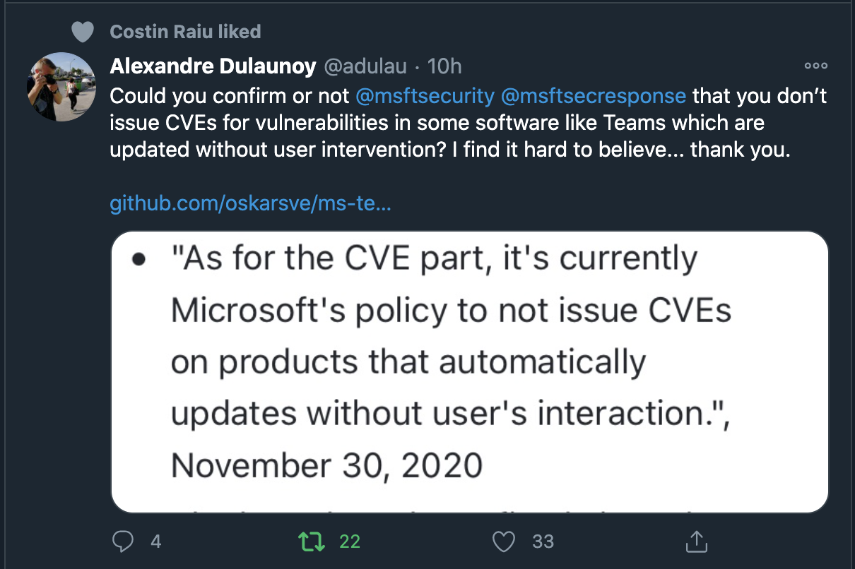I wanted everyone to browse here and enjoy this Microsoft Teams vulnerability: https://github.com/oskarsve/ms-teams-rce/blob/main/README.md