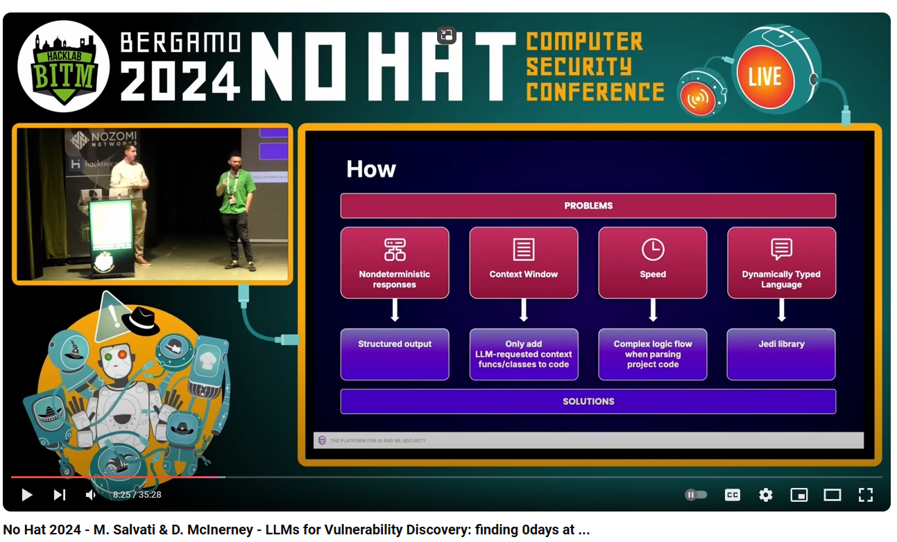 All of which is to say that while NO HAT http://nohat.it is a very good conference, with a lot of great talks, the one I have enjoyed the most so far is "LLMs FOR VULNERABILITY DISCOVERY: FINDING 0DAYS AT SCALE WITH A CLICK OF A BUTTON https://www.youtube.com/watch?v=Z5LMRS3AF1k" (by Marcello Salvati and Dan McInerney). This talk goes over their lessons learned developing VulnHunter https://github.com/protectai/vulnhuntr, which finds real vulns in Python apps given just the source directory, and those lessons are roughly as follows: