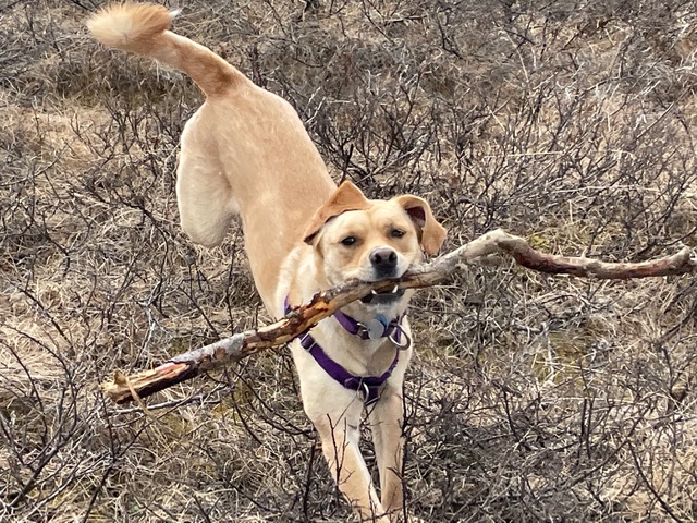 Thistle, Sally’s dog. This is in Fairbanks, I think at the top of Murphy Dome. And yes, she is a stick dog!