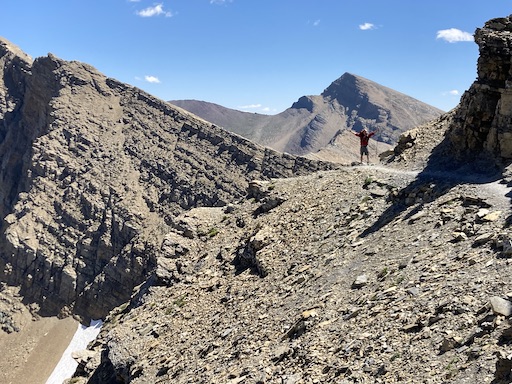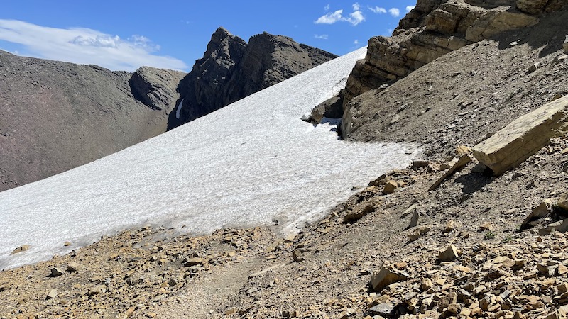 */One of the hazards of letting a first timer lead is that they can go the wrong way, especially if their guide is too busy babbling telling dad jokes (or even worse jokes!). And so it was that suddenly the trail went in to a snowfield right at the pass. The park information page said the pass was open, so maybe we just needed to scramble along the snow, which we did try before giving up. Perhaps we could circumvent it going up the scree on the right -- there were footprints that looked like others had gone that way. No, the rocks were way too loose. So backtrack down the trail a bit where we discovered where the switchbacks start that we had missed.