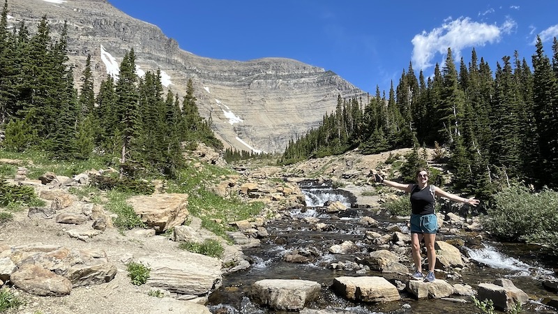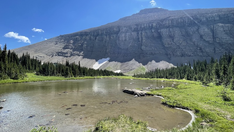 */The ponds below Siyeh drain into this creek. Every other time I've hiked this, it was a bit tricky selecting a route across it, trying to choose rocks that allow passage without falling in. But the trail crews must have been through and put a series of large stones in place. Gorgeous clear blue sky and pleasant weather. /*