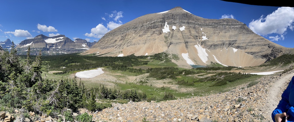 */After the creek the trail goes uphill before entering the scree switchbacks. This is the view looking back where we had come from. Down below is Preston Park. On the upper right is Piegan Glacier. The pointy peak at the left is Mt. Reynolds at Logan Pass. It's impossible to capture in photos the immense peripheral view from the trail from all directions. It was near this point the stranger on the trail gave us the day's adjective of stupendous. /*