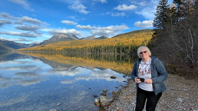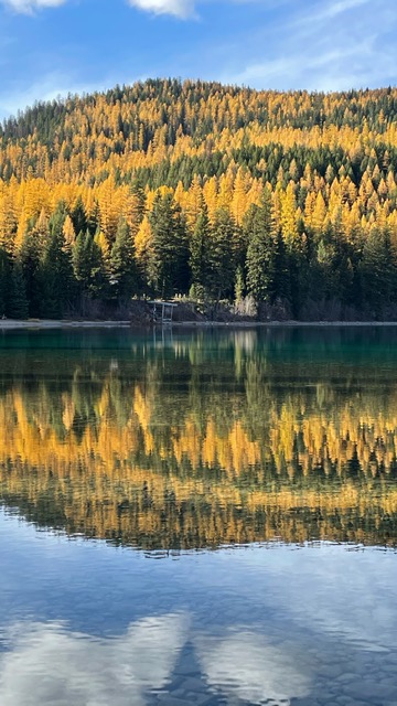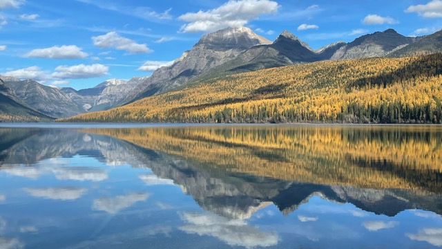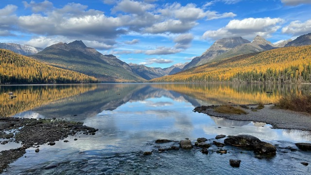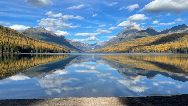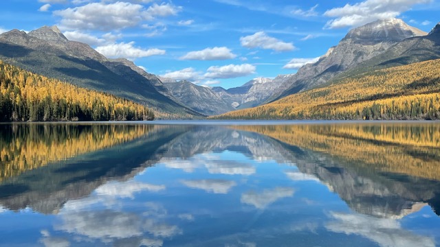 Bowman Lake. Partly sunny, still water, and the fall color of golden Larch trees line either shore. Photos cannot capture how amazing the sight really is in person. We counted a total of 6 other people at the lake while we were there, so nearly that section of Glacier National Park to ourselves.