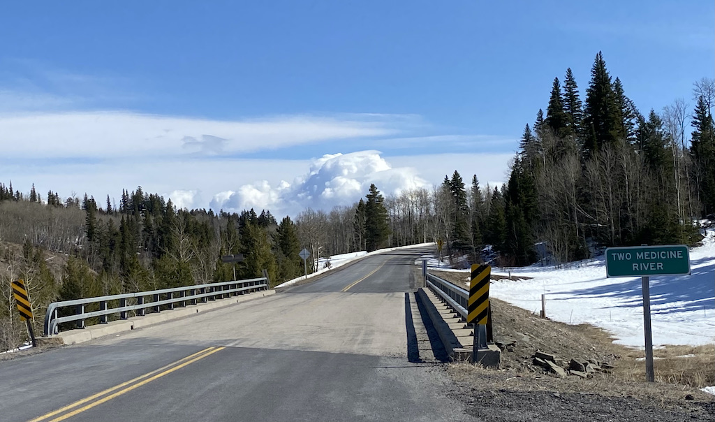 Montana Hwy 49. Looking Glass Highway. The winter closure is just after the Two Medicine turn off. In the photo there are two cars parked next to the barricades. Blue sky with the ever present east side breeze, maybe about 40 degrees.
