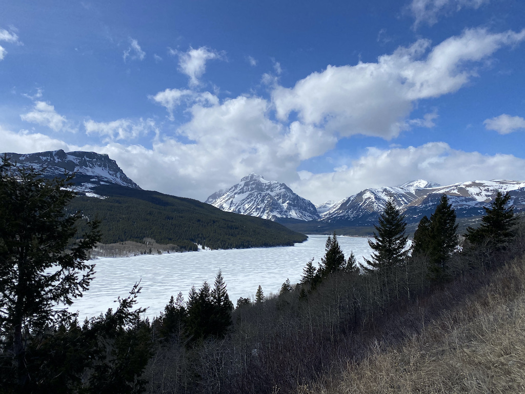 This is our view as we bike up. Lower Two Med Lake is frozen solid. Scenic Point to the left, and Sinopah Mountain https://en.wikipedia.org/wiki/Sinopah_Mountain is in the middle. Big Sky country. You should really see what it looks like in person!