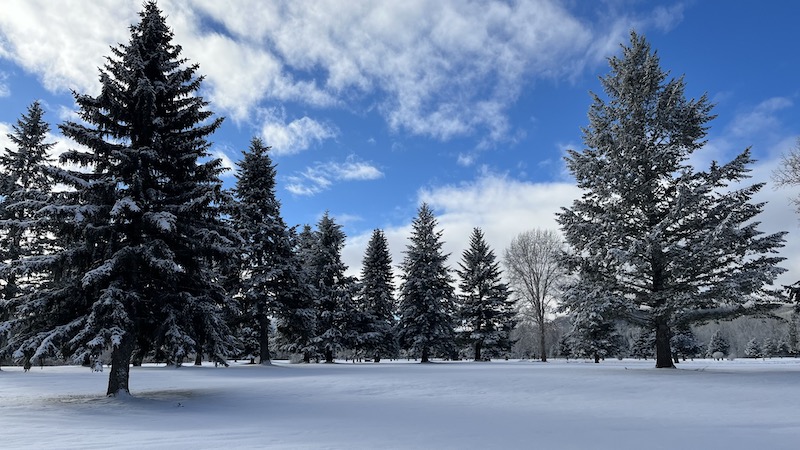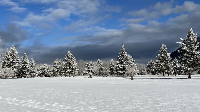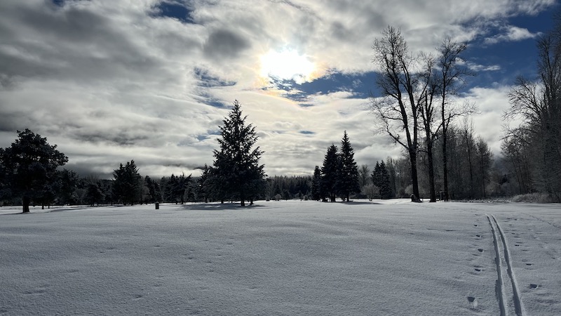 But yesterday we received about 2 inches of new snow. Not much, but enough to cover the landscape and provide us with a White Christmas! Just enough to allow for skiing right out the door and around the golf course, with blue sky and sun to brighten the views. I had the pleasure of cutting the first trail.