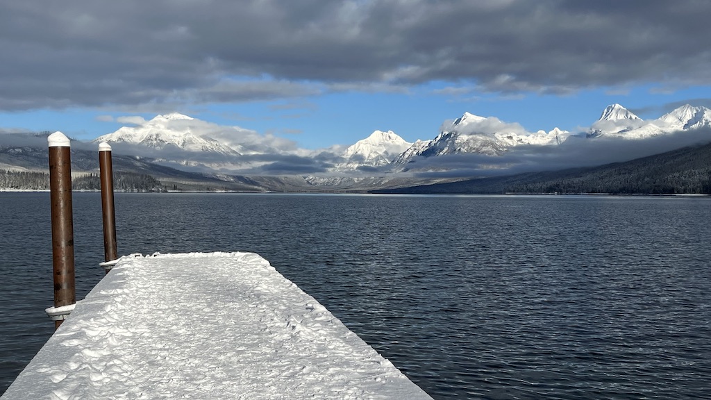 The iconic boat dock on Lake McDonald with the park's mountains beyond the end of the lake.