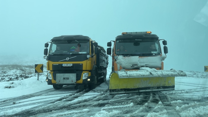 The road continued to go up, and the snow on the road was 2~3 inches deep, which was right at the point that Faith was nervous about driving in it. As we were looking for a place to turn around and go back down, we crested the summit where the Irish snowplows were. I never expected to see this in Ireland!! After the summit, the snow petered out as we headed down.