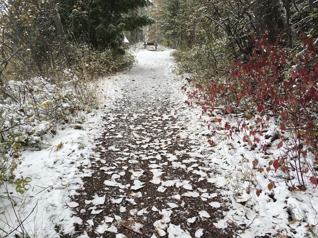 I'm not sure why I stopped, but I did at this point and looked back up the trail. The texture of the snow covered leaves pattern, the red leaves, the whole trail is brilliant. No better birthday present exists .... though some well aged scotches are competitive.