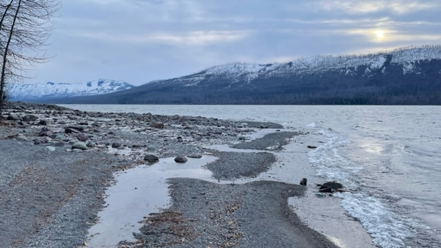Westward view is where Snyder Creek flows in to the lake, with the sun setting over Howe Ridge, and the Apgar mountains further away on the left.