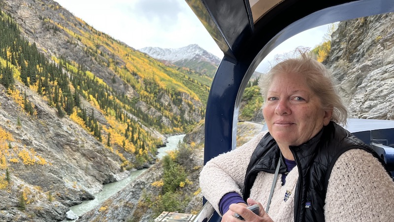 September was an Alaska trip starting with riding the Alaska Railroad from Anchorage to Fairbanks. It was their last day of the season with the dome cars. Enjoyed the fall colors. Wonderful equipment, meals, and scenery. One highlight was arriving into Fairbanks at 8pm in the dark. Sally brought Thistle with her to pick us up. Thistle has been to the airport to greet arriving people numerous times and is familiar with that routine; anytime she is in the car and gets near the airport she gets very excited. But she had never been to the train station, and when she first saw Sandy it so surprised her with barking, yelping, jumping for joy the other people detraining where quite taken aback by this wild dog!