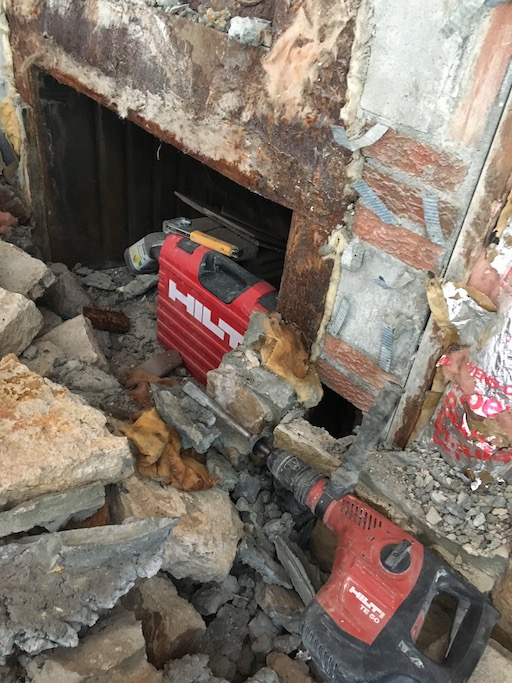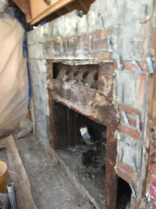 Thus the plan was to have the existing inside the house wall of stonework removed to provide access to the firebox for its removal, then frame a new flat wall with new stonework.