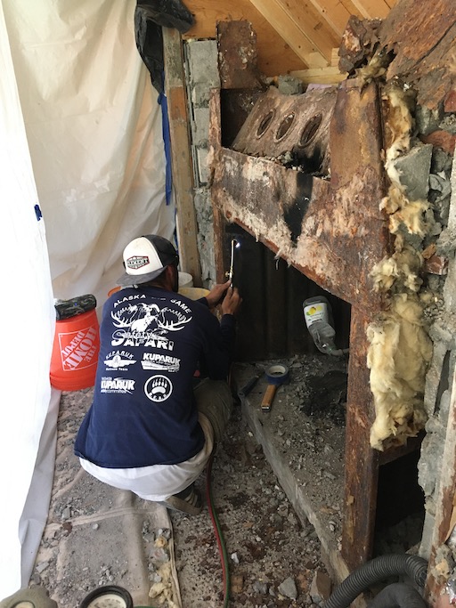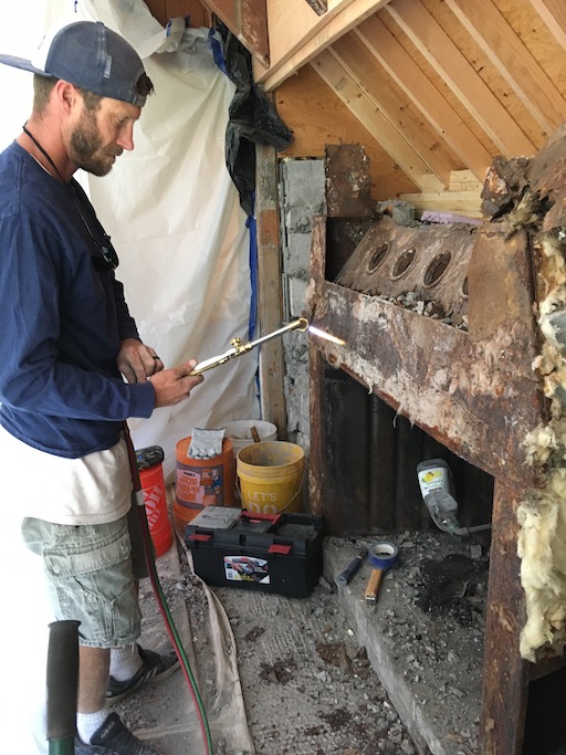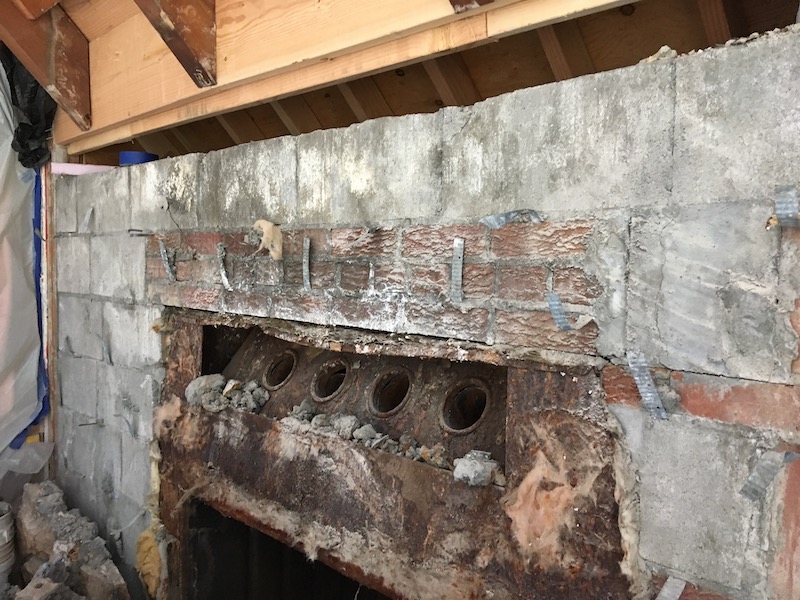 Inside the "tent", with the stonework removed. At this point we can clearly see a cinder block wall around the massive firebox. There are a few metal tabs attached to the cinder block -- these were all that anchored the stone; a small earthquake would have easily brought all that stone crumbling down. As our mason said -- "We don't build like that anymore".