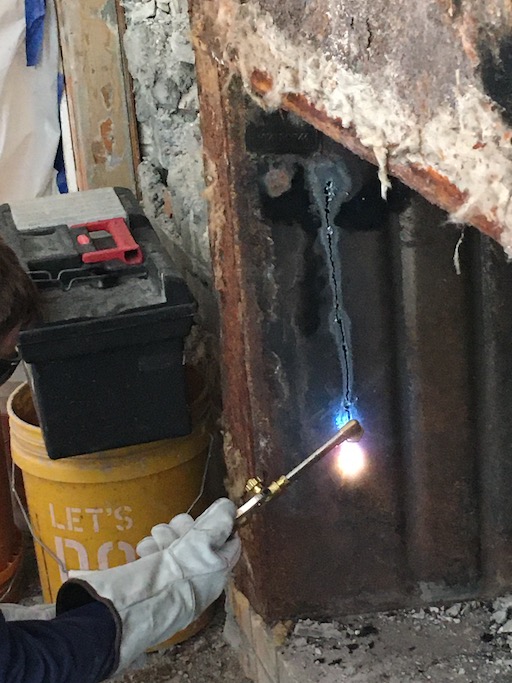 When the torching was completed and it seemed the work was complete except for cleanup, I went for a run. On my return it looked like this photo. The mish mash jumbles of blocks and bricks on the left side were for the flue that extended to the basement, where we think at one time there was a wood burning fireplace. Definitely screamed the look of cowboy construction. The tent is removed and the area is very clean.