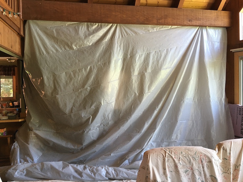 The stonework is removed, one rock at a time, using a portable jackhammer. This generates and incredible amount of dust, so the first step is to tent it up as much as possible. Furniture was all covered in sheets. Pictures all removed due to vibrations.
