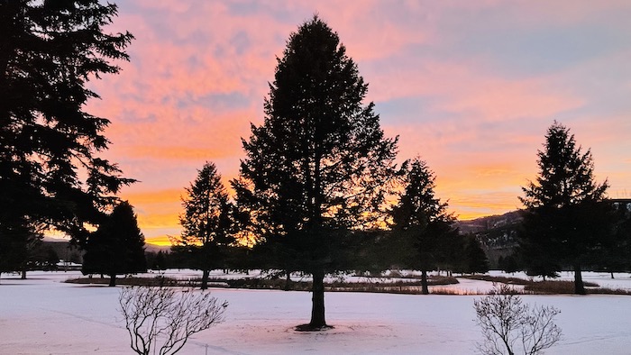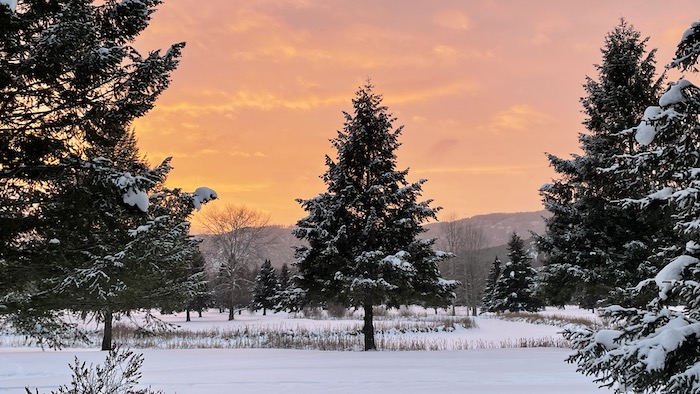 12/15/22: 4:35pm It had just snowed, leaving the trees white to contrast with the orange sky.