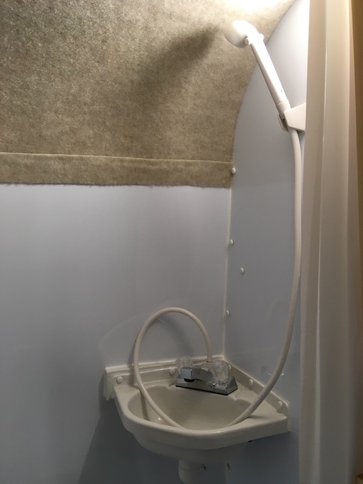 The bathroom contains not only the throne, but also a shower and sink.