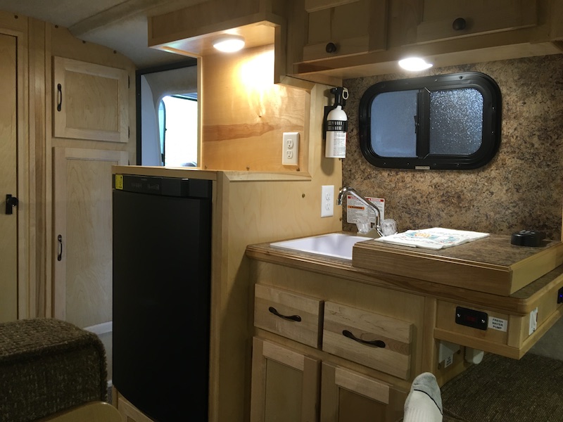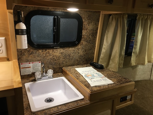 The kitchen. Underneath the cover next to the sink is the 2 burner propane stove.