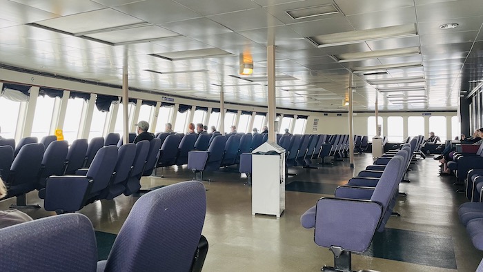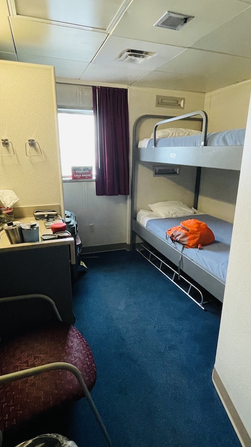Unlike Amtrak, meals are not included as part of the sleeping accommodation. We had a large cooler with fixings for breakfast and lunch, but did have dinners in the restaurant. That was the only place on the ferry one could purchase beer or wine. There were crossed out signs onboard that pointed to a cocktail lounge which must no longer exist. I had brought enough Cold Smoke in the cooler in the cabin to see me thru the trip.