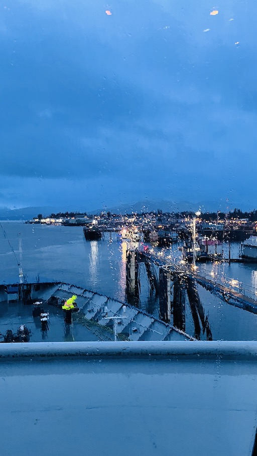 Typical Pacific Northwest for the 3.5 day journey. Cloudy and drizzle at times. Some occasional clearing which gave hints of the snow covered coastal mountains.