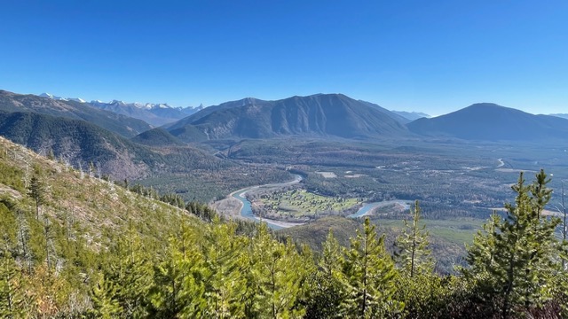 There is a great view near the top of all of beautiful West Glacier, Montana. The horseshoe bend of the Middle Fork of the Flathead River meanders around Glacier View Gold Course, and our house on the 18th fairway is visible. The few buildings and shops in town are hidden in the trees beyond. This time of year everything is closed in West Glacier except the elementary school and the post office.